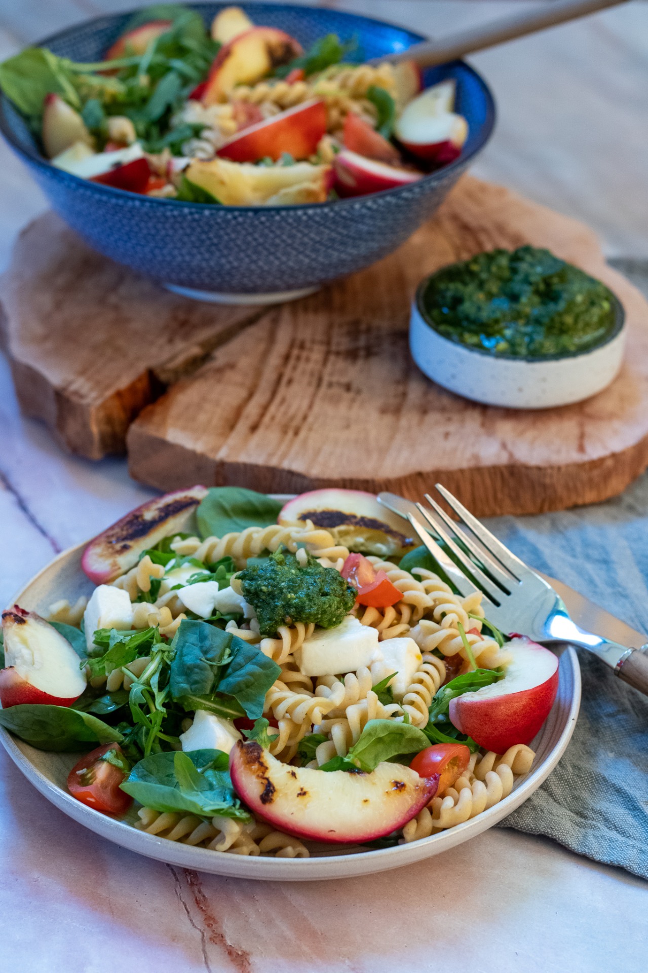 De pastasalade heb ik zomers gemaakt, want het was de afgelopen dagen toch wel echt warm. Dus ik heb gekozen om in mijn pastasalade gegrilde nectarines te verwerken, daarnaast uiteraard pasta. Ik heb hier gekozen voor volkoren spirelli en dit geheel dan opgefrist met enkele groentjes.